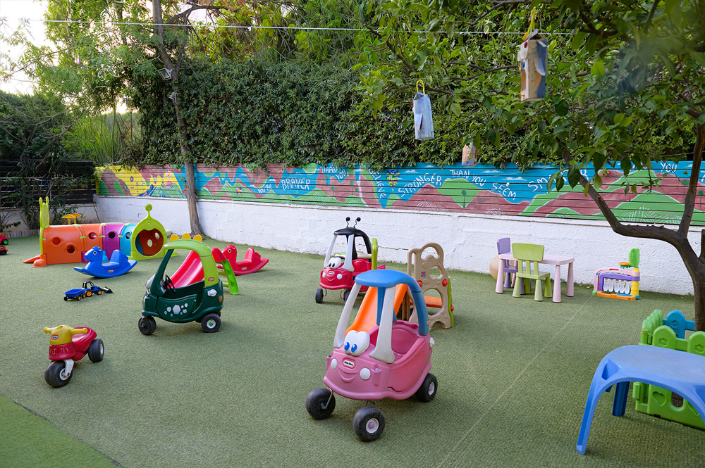Ο εξωτερικός χώρος είναι γεμάτος από όμορφα δέντρα και κρυψώνες όπου τα παιδιά μπορούν να παίξουν, να εξερευνήσουν και να πειραματιστούν.